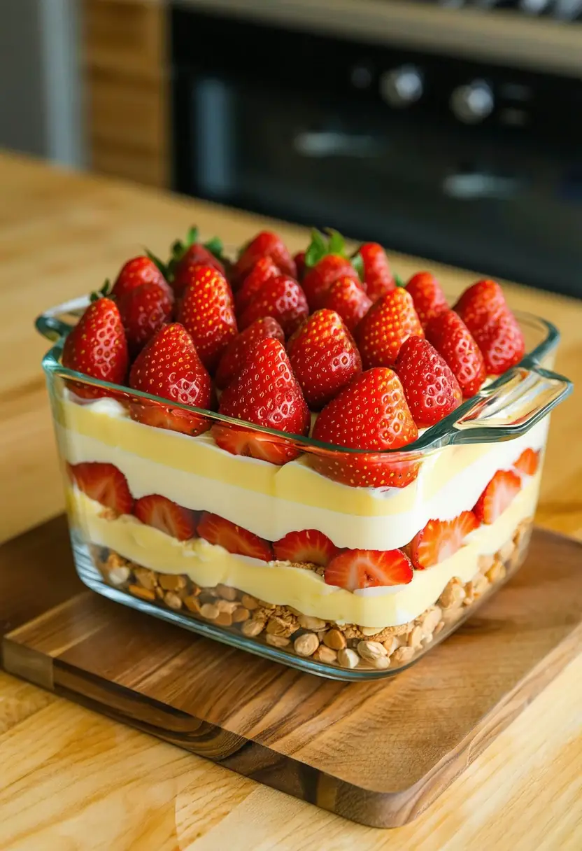Repita as camadas até terminar os ingredientes, finalizando com creme e morangos inteiros para decorar.