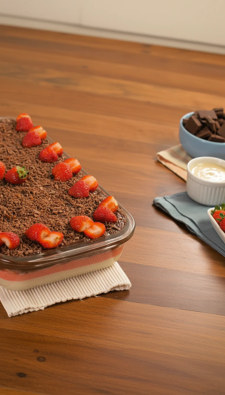 Um pavê irresistível que combina a cremosidade do creme branco com o sabor intenso do chocolate e o frescor do morango. Camadas de biscoito champanhe embebido em leite embebido, intercaladas com os cremes, criam uma experiência única para o paladar.