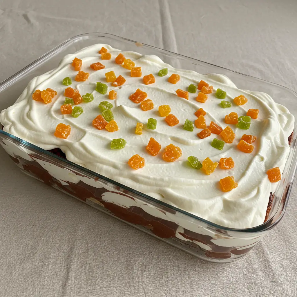 Cubra a última camada com o chantilly batido e finalize decorando com granulado de chocolate e frutas cristalizadas.
