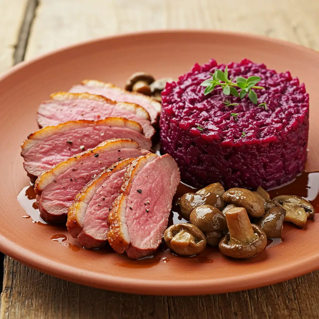 Peito de Pato com Risotto de Beterraba e Cogumelos