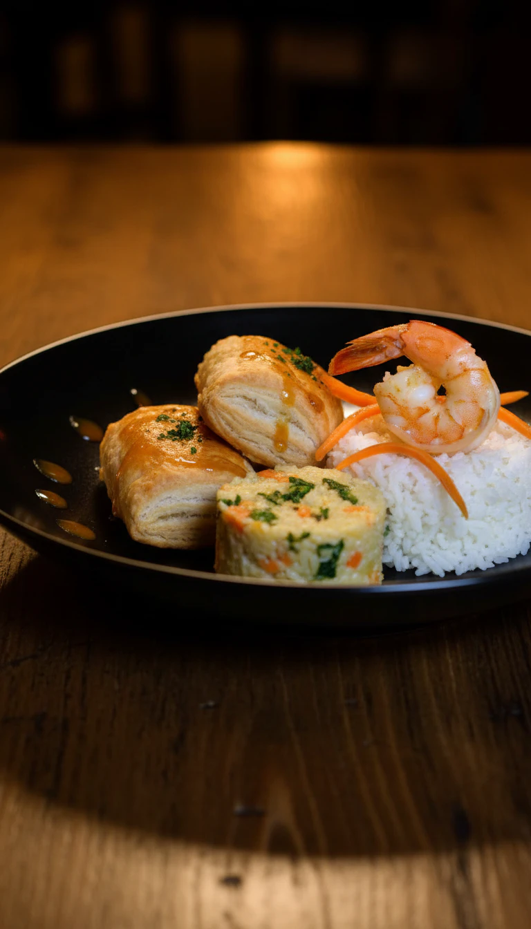 Um saboroso filé de peixe grelhado, acompanhado de um suculento camarão e uma farofa de banana cremosa, finalizado com um toque especial de leite de coco no arroz. Uma explosão de sabores da culinária brasileira!