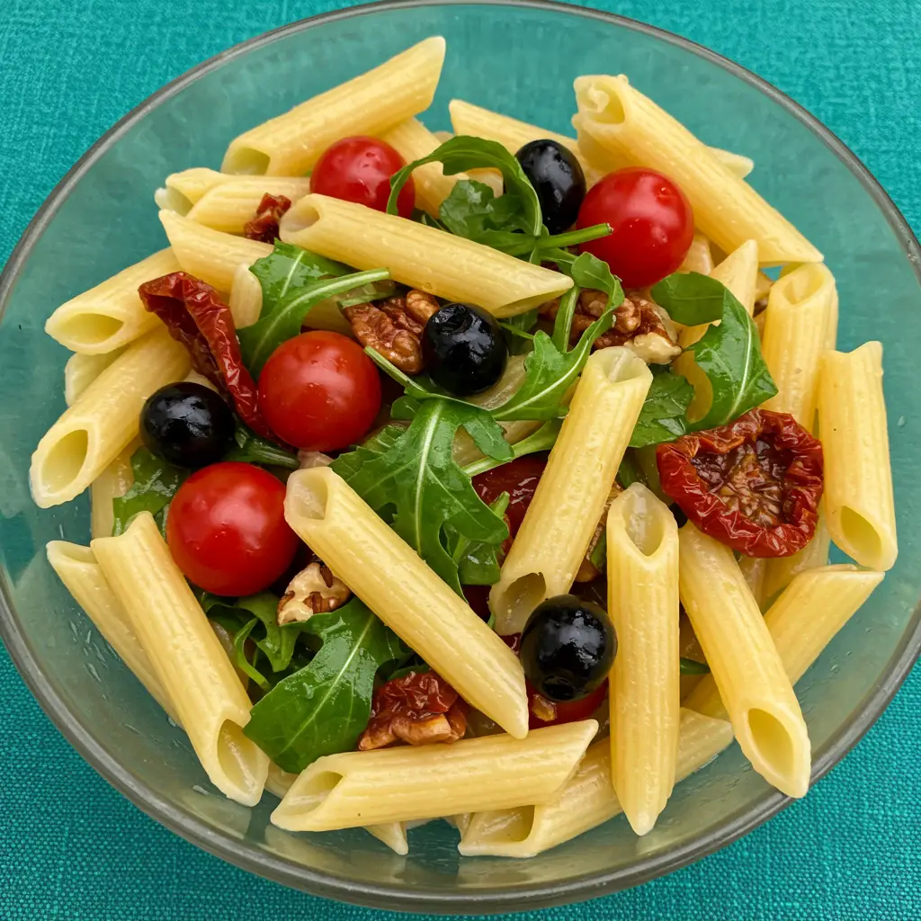 Um prato saboroso e rápido de preparar! A combinação perfeita de penne al dente com tomates secos, rúcula fresca e azeitonas pretas, finalizado com um toque de nozes. Uma explosão de sabores mediterrâneos!