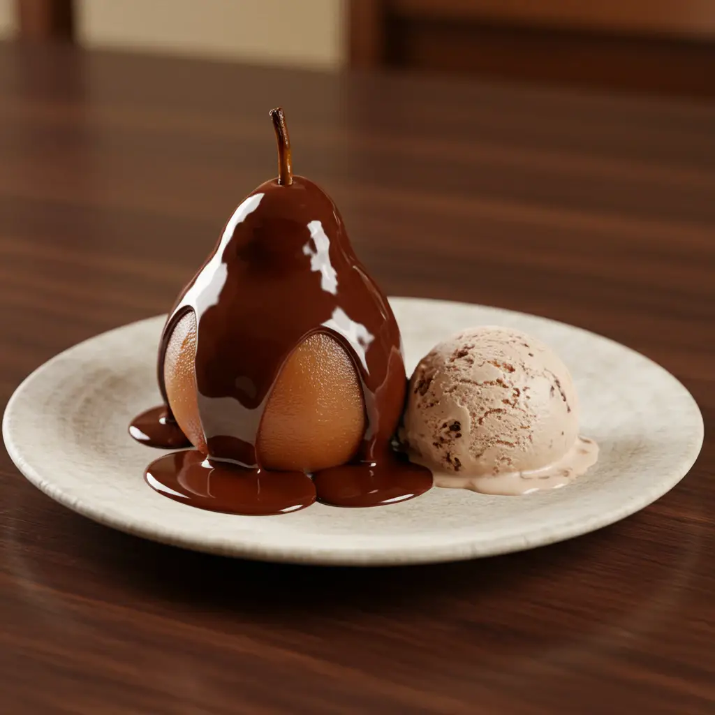 Delicadas pêras cozidas em vinho branco, envoltas em uma suave calda de chocolate meio amargo e servidas com bolas de sorvete cremoso. Uma sobremesa elegante e sofisticada, perfeita para encantar seus convidados.