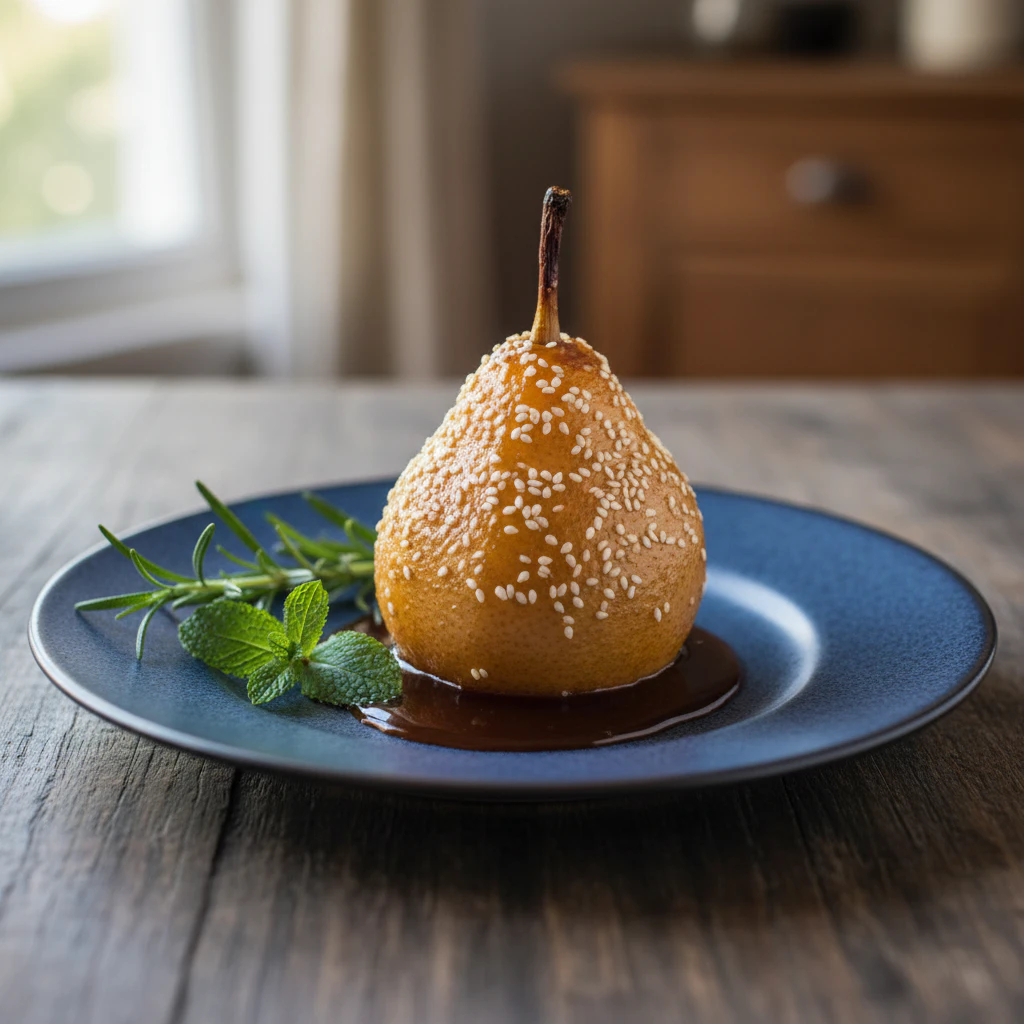 Polvilhe o gergelim branco sobre as pêras.