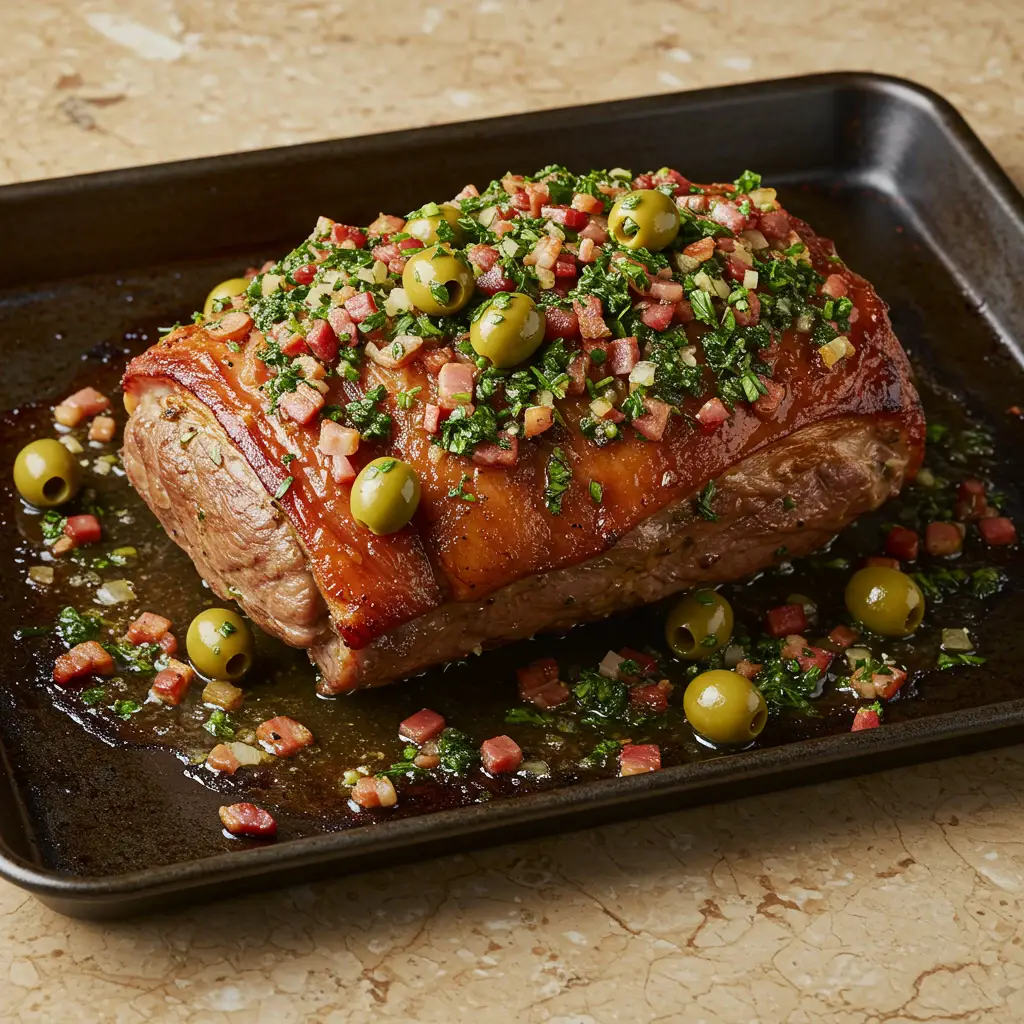 Um pernil suculento e saboroso, marinado com coentro fresco, alho, limão e bacon. Perfeito para um almoço de domingo em família ou uma celebração especial.