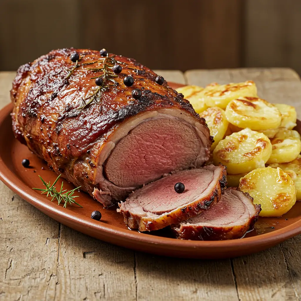 Um pernil de cordeiro suculento e aromático, assado com zimbro e acompanhado de batatas cremosas gratinadas. Uma combinação perfeita de sabores e texturas para uma refeição inesquecível.