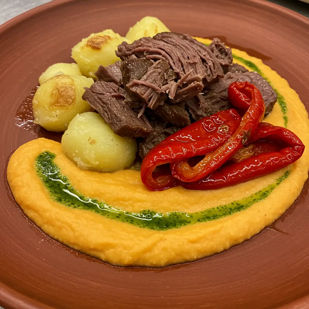 Um pernil de cordeiro suculento e macio, confitado em azeite e ervas, acompanhado de batatas assadas e um delicioso purê de tomate picante. Uma experiência gastronômica inesquecível!