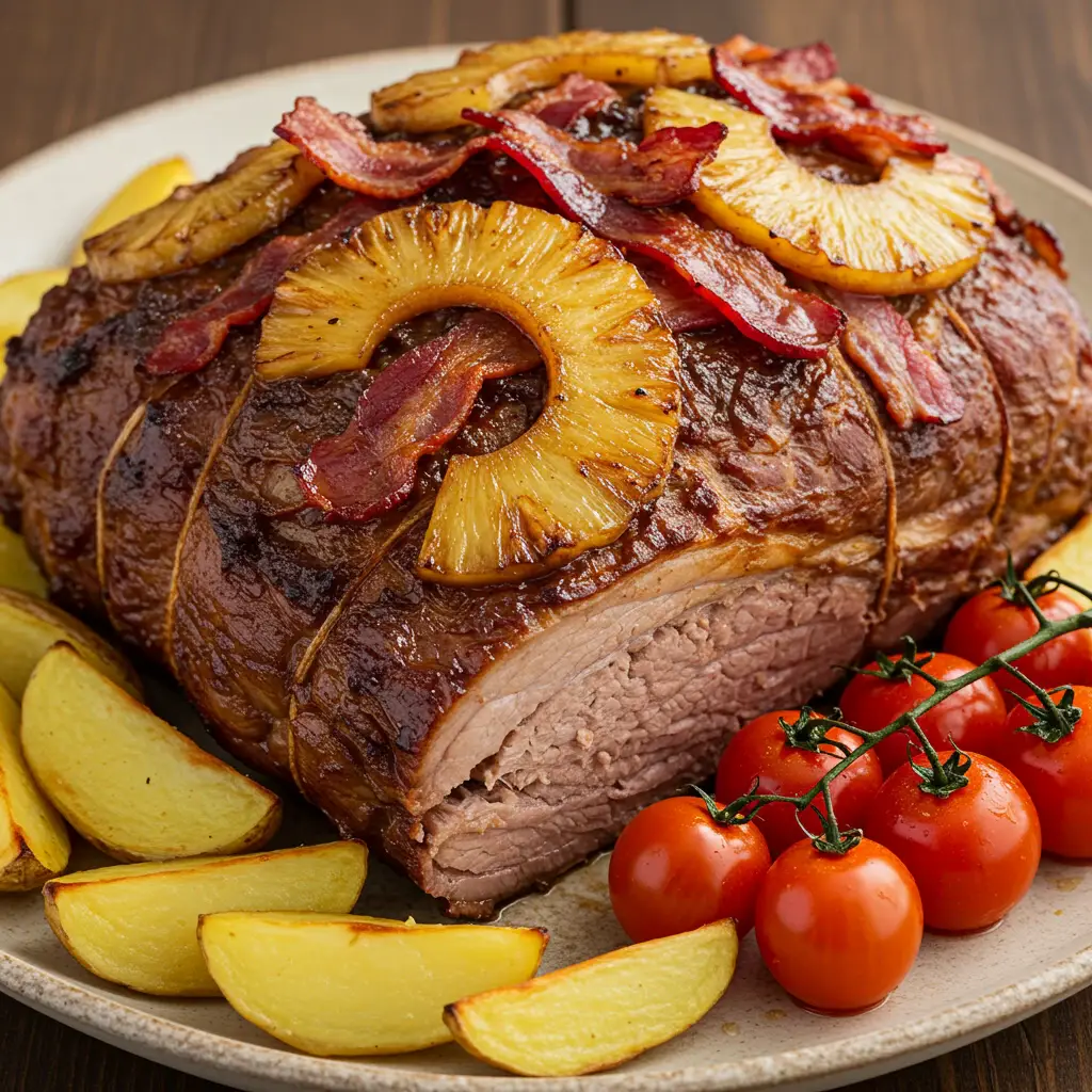 Um pernil de peru suculento e saboroso, assado com um toque tropical de abacaxi e o crocante do bacon. Perfeito para um almoço de domingo especial ou uma ceia inesquecível!