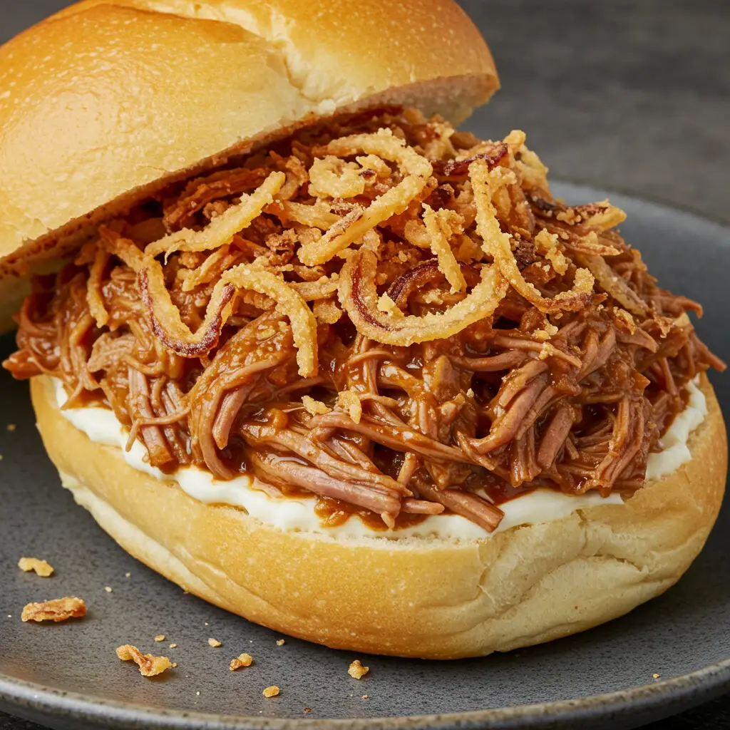 Um sanduíche irresistível! Pernil de porco desfiado, suculento e com um molho agridoce incrivelmente saboroso, perfeito para um lanche especial ou um almoço informal.
