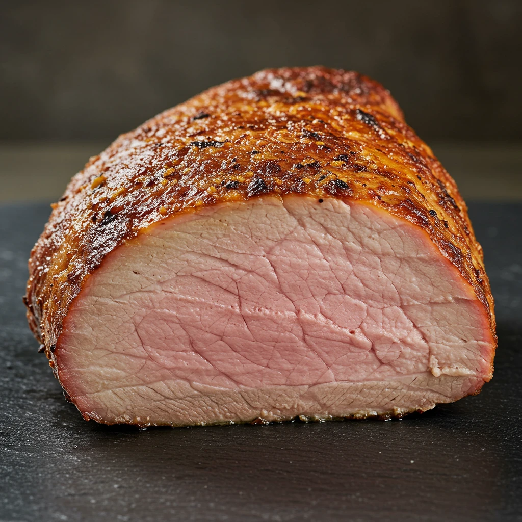 Uma picanha suína macia e saborosa, assada no forno até ficar dourada e suculenta. O alho picado realça o sabor da carne, criando um prato simples, porém inesquecível.
