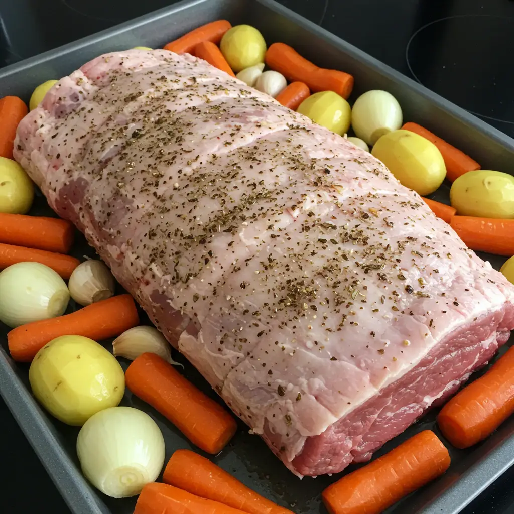 Uma picanha suína assada no forno, suculenta e saborosa, acompanhada de legumes assados. Receita simples e deliciosa, perfeita para um jantar em família.