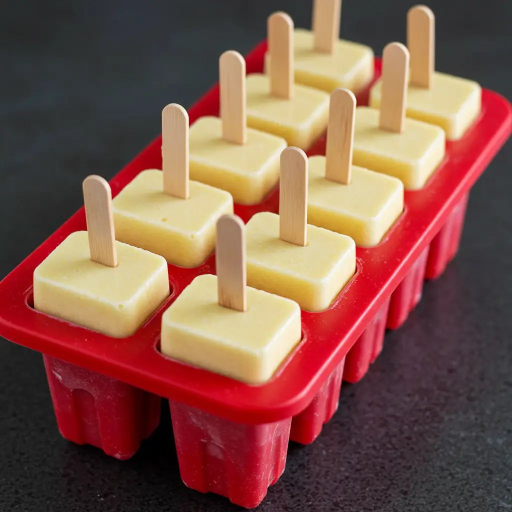 Insira os palitos nos picolés e leve ao freezer por pelo menos 4 horas, ou até que estejam completamente congelados.