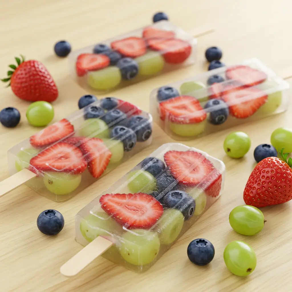 Em forminhas para picolé ou copinhos plásticos, distribua as frutas de forma homogênea.