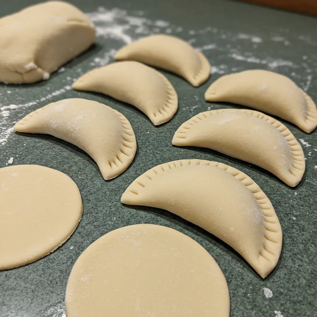 Coloque uma porção do recheio no centro de cada círculo de massa. Dobre a massa ao meio, formando um semi-círculo, e pressione as bordas com um garfo para fechar.