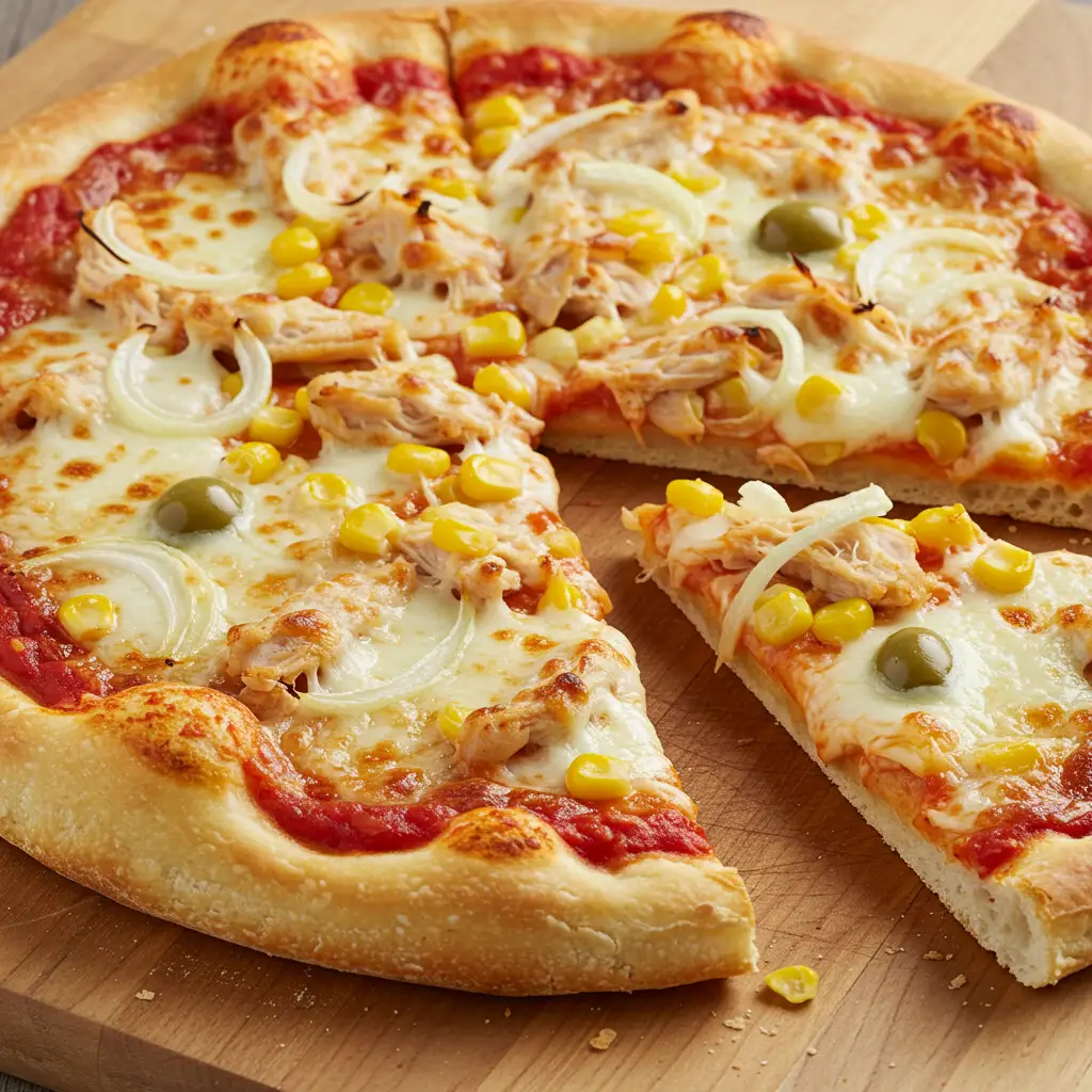 Uma deliciosa pizza com o sabor do interior! Massa caseira fofinha, coberta com molho de tomate, frango desfiado, mussarela derretida, requeijão cremoso e o toque especial das azeitonas, milho e cebola. Uma explosão de sabores que vai te conquistar!