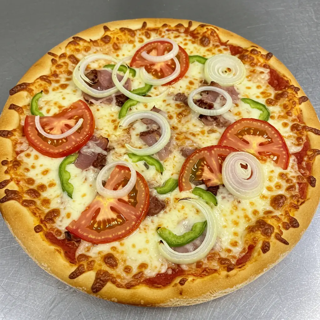 Uma pizza caseira deliciosa, feita com massa leve e saborosa, ideal para um jantar especial. Assada no forno a lenha, ela ganha um sabor único e inigualável. Experimente!