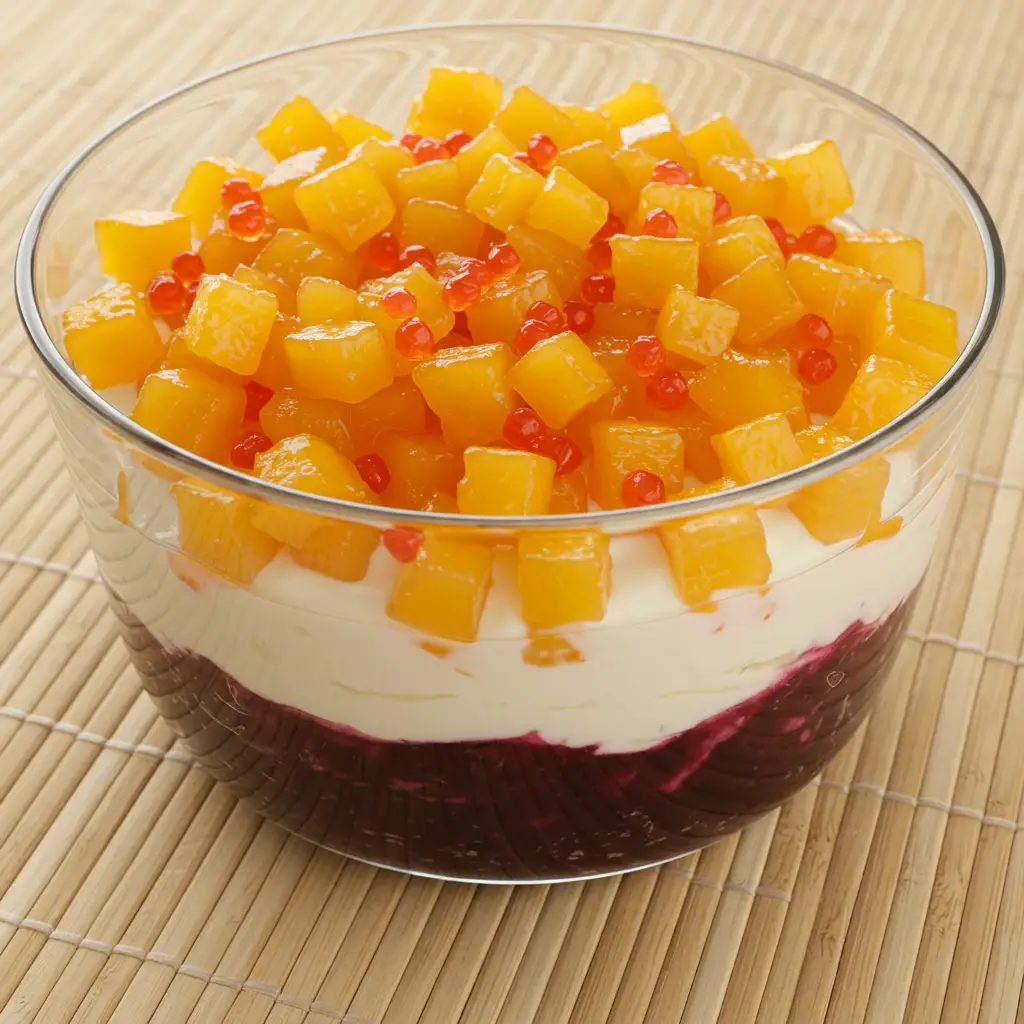 Uma sobremesa divertida e refrescante! Camadas de gelatina de morango, abacaxi e uva, cobertas com chantilly e frutas frescas. Perfeita para festas e momentos especiais.