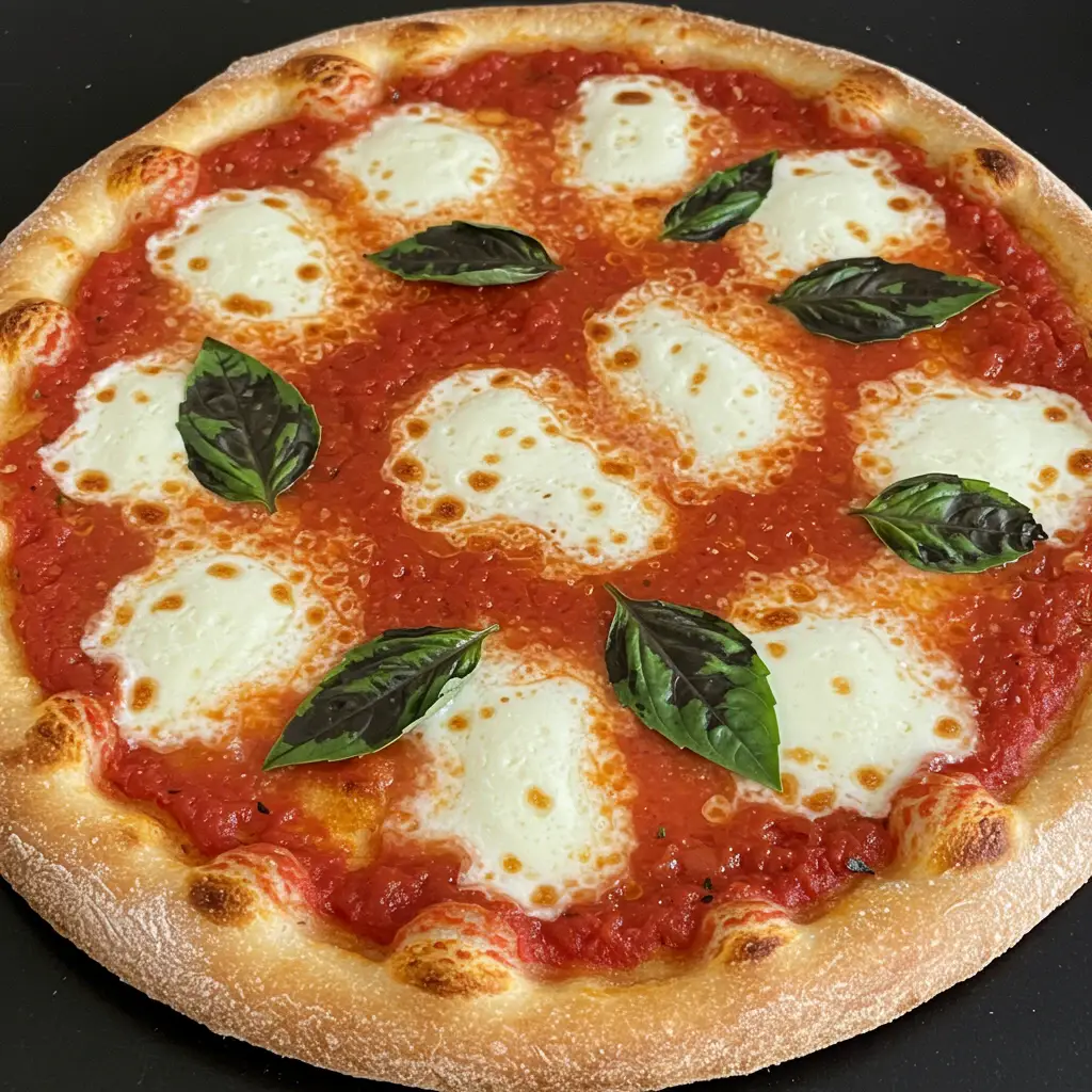Uma pizza margherita clássica e deliciosa, perfeita para uma noite aconchegante. Massa leve e saborosa, coberta com tomates frescos, mussarela derretida e um toque de manjericão.