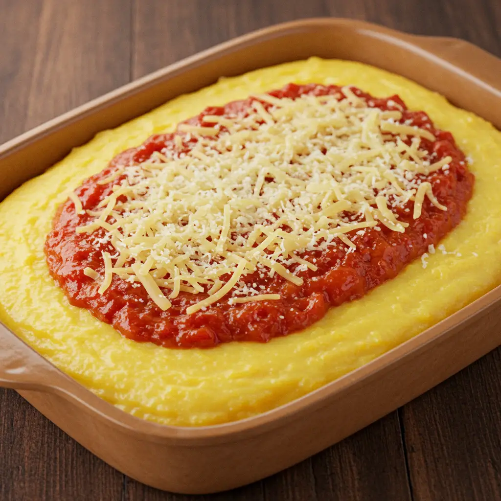 Transfira a polenta para um refratário. Cubra com o molho de tomate aquecido e o queijo parmesão ralado a gosto.