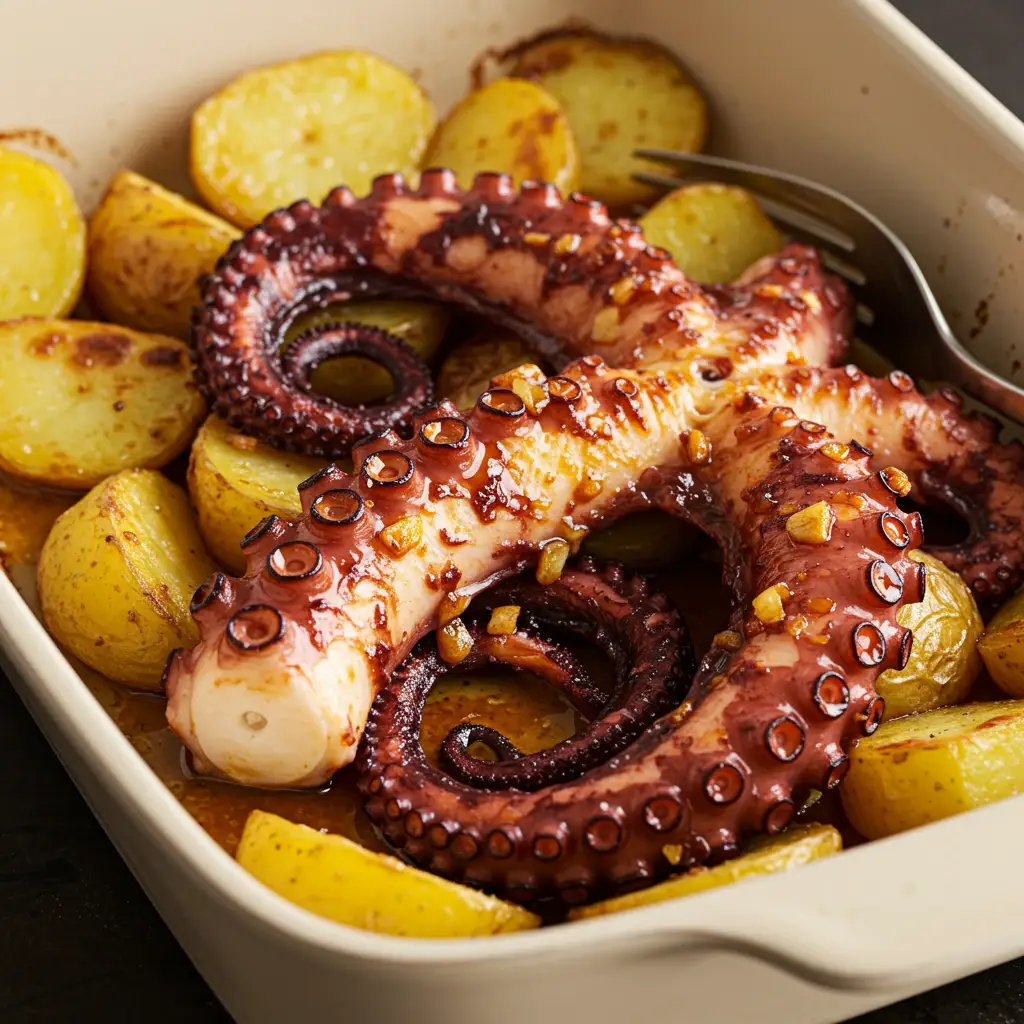 Polvo assado com batatas ao alho