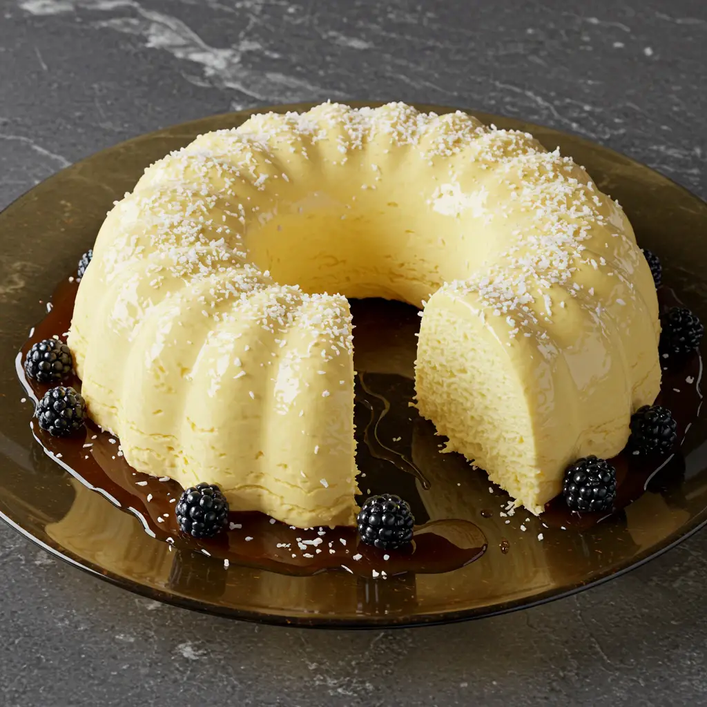 Desenforme cuidadosamente o pudim e polvilhe com o coco ralado antes de servir.