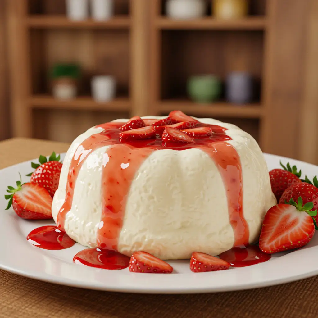 Um pudim leve e cremoso, feito com iogurte, que derrete na boca. A calda de morango traz um toque doce e frutado, perfeito para encantar a todos.