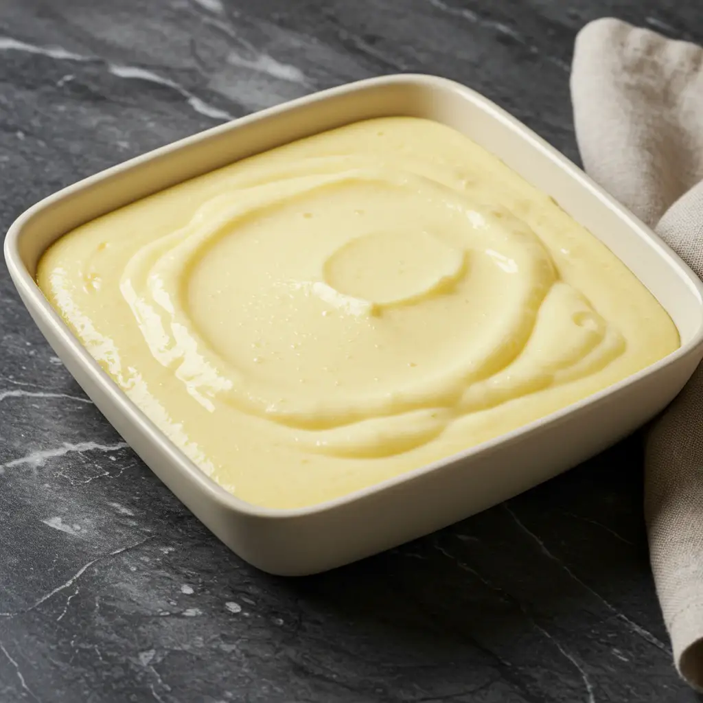 Despeje o creme sobre as camadas de pão, presunto e mussarela no pirex.