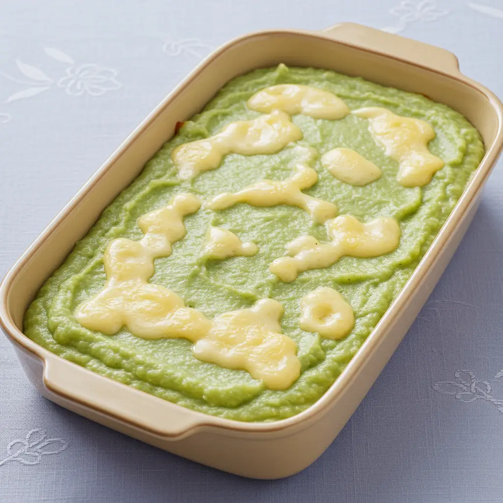 Em um refratário médio, espalhe metade do purê, alisando a superfície com o fundo de uma colher.