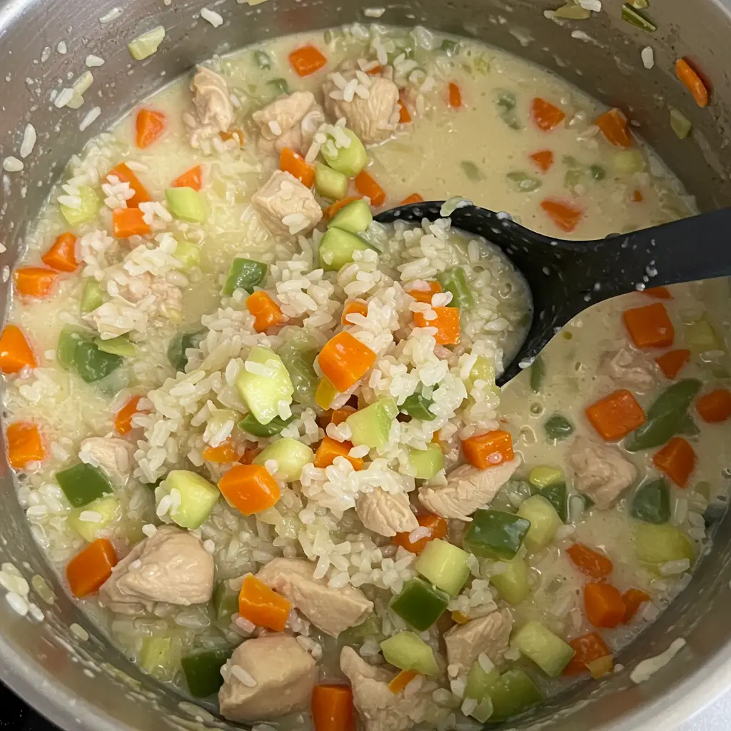 Quando o arroz estiver quase pronto, junte os legumes ao molho de frango, misture bem e cozinhe por mais alguns minutos até que tudo esteja bem incorporado.