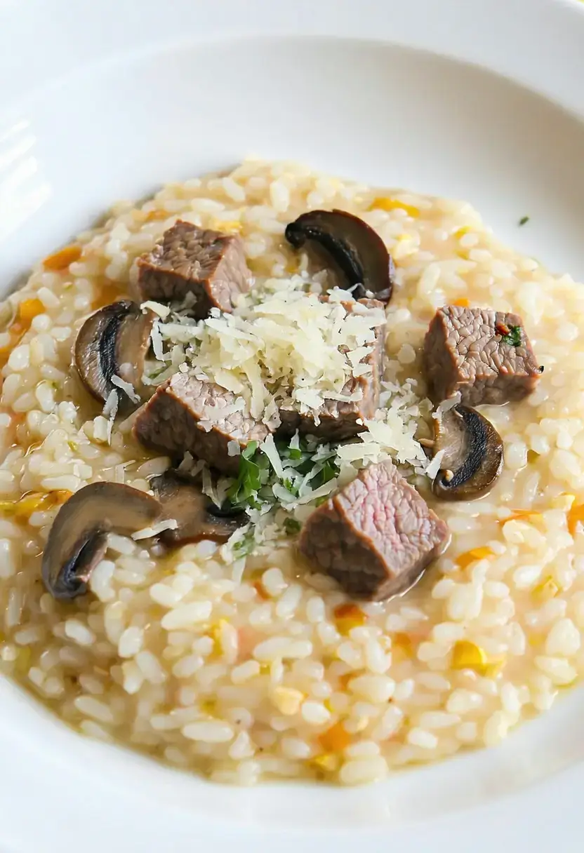 Delicie-se com este risoto cremoso, que combina a suculência do filé mignon com a intensidade dos cogumelos. Uma explosão de sabores que vai aquecer seu coração!