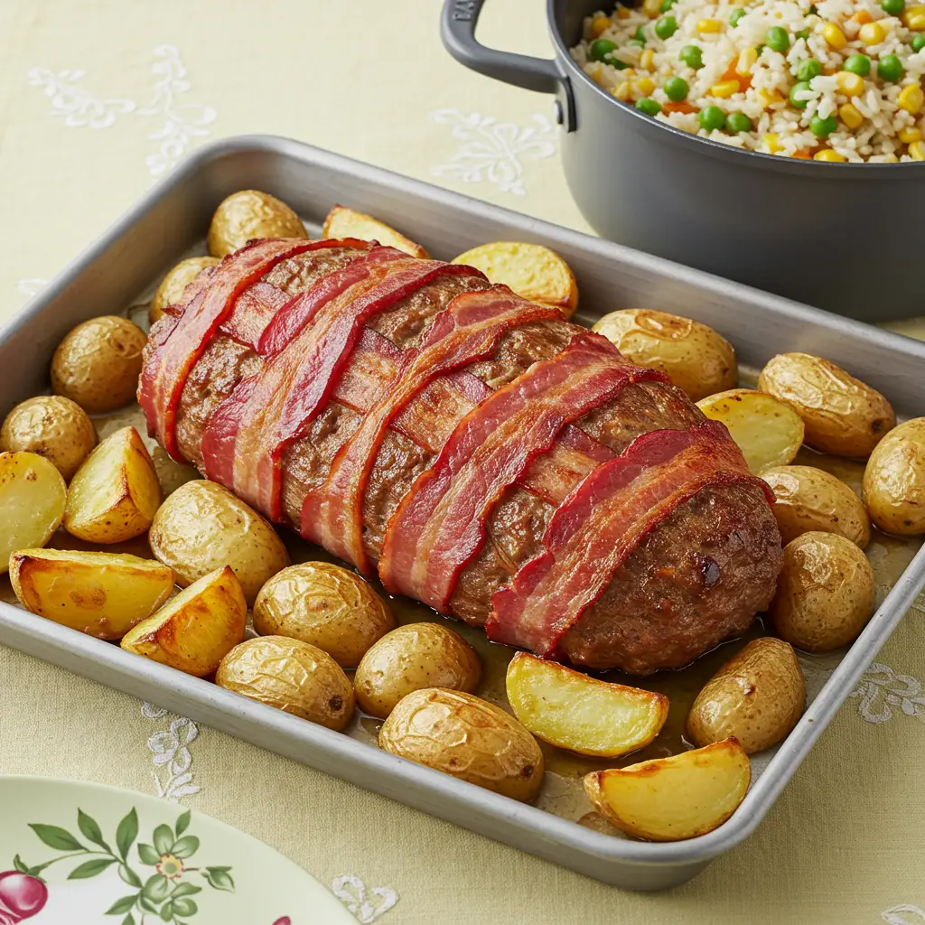 Rocambole suculento de carne moída, recheado com presunto e mussarela, envolto em bacon crocante e acompanhado de batatas douradas ao azeite. Um prato completo e saboroso para toda a família!