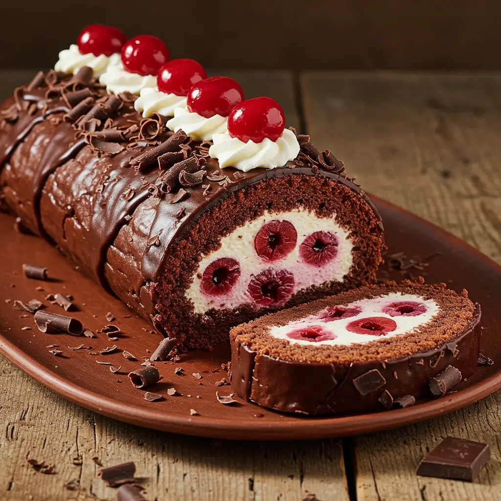 Um rocambole de chocolate úmido e macio, recheado com um delicioso creme de chantilly e cerejas, coberto com ganache de chocolate meio amargo. Uma sobremesa sofisticada e irresistível!