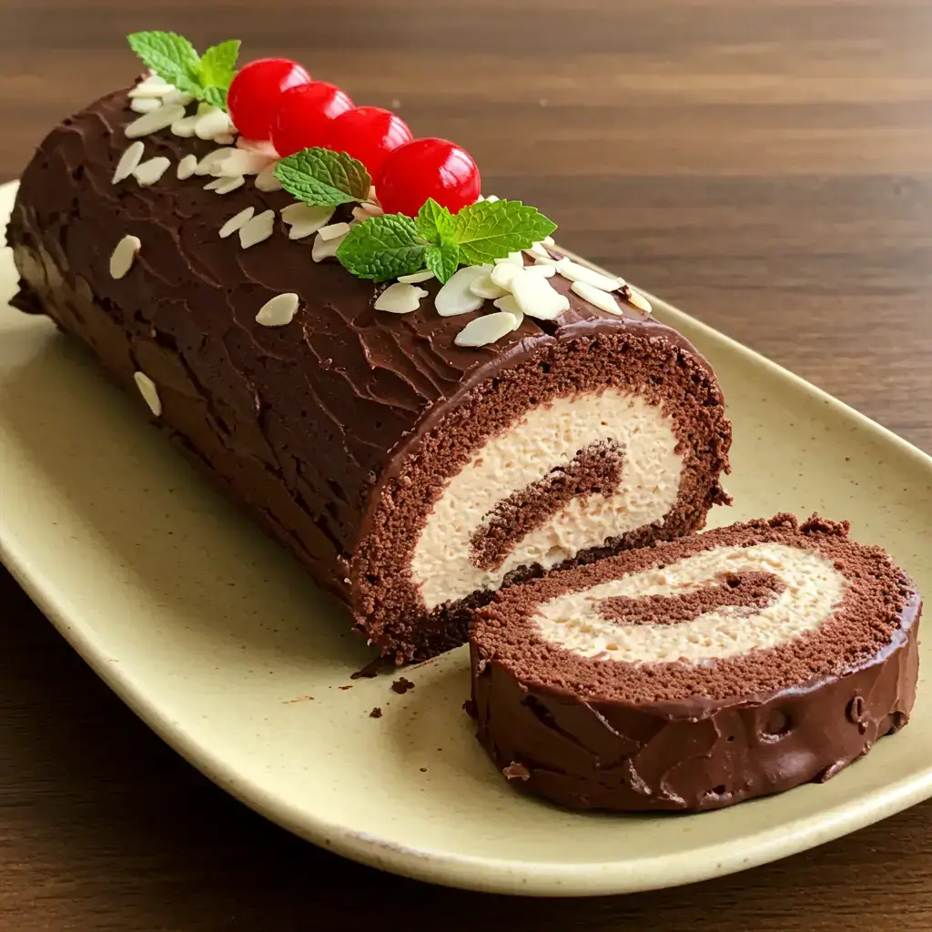 Um irresistível rocambole de chocolate, com um delicado recheio de creme de amêndoas e coberto por uma ganache brilhante. Perfeito para encantar seus convidados!