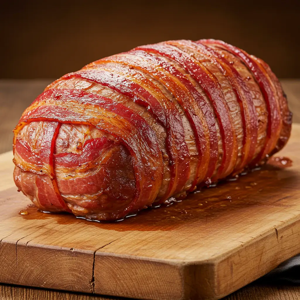 Um suculento rosbife envolto em bacon, perfumado com ervas frescas e finalizado com um molho saboroso. Carne macia e sabor intenso, perfeito para um jantar especial.