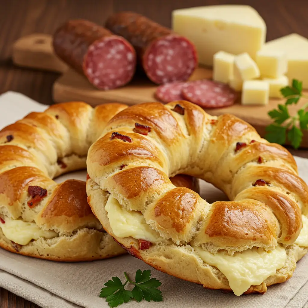 Uma rosca deliciosa e irresistível, com um recheio saboroso de carne seca, calabresa, queijo prato e muito mais! Perfeita para um almoço em família ou um lanche especial.