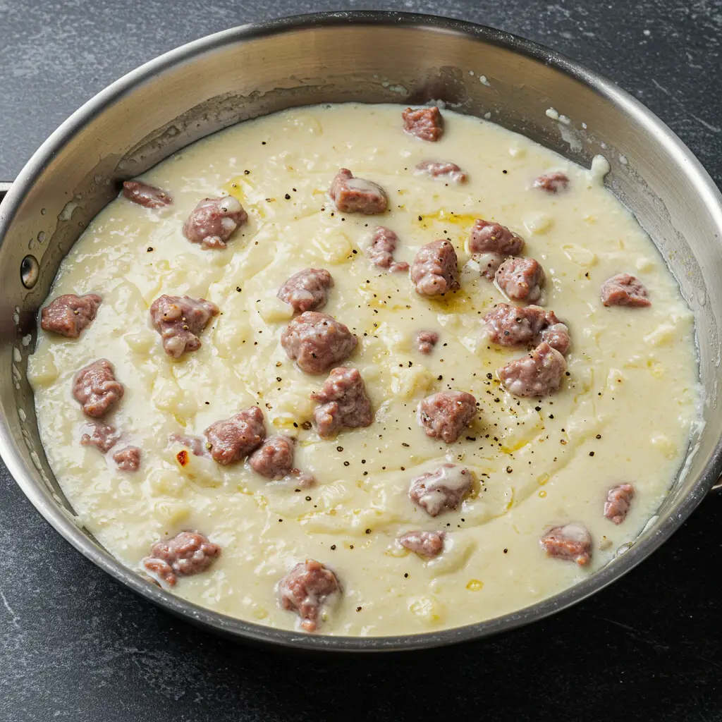 Abra a panela, adicione a linguiça calabresa cortada em rodelas de aproximadamente 2 cm e cozinhe por mais 5 minutos.