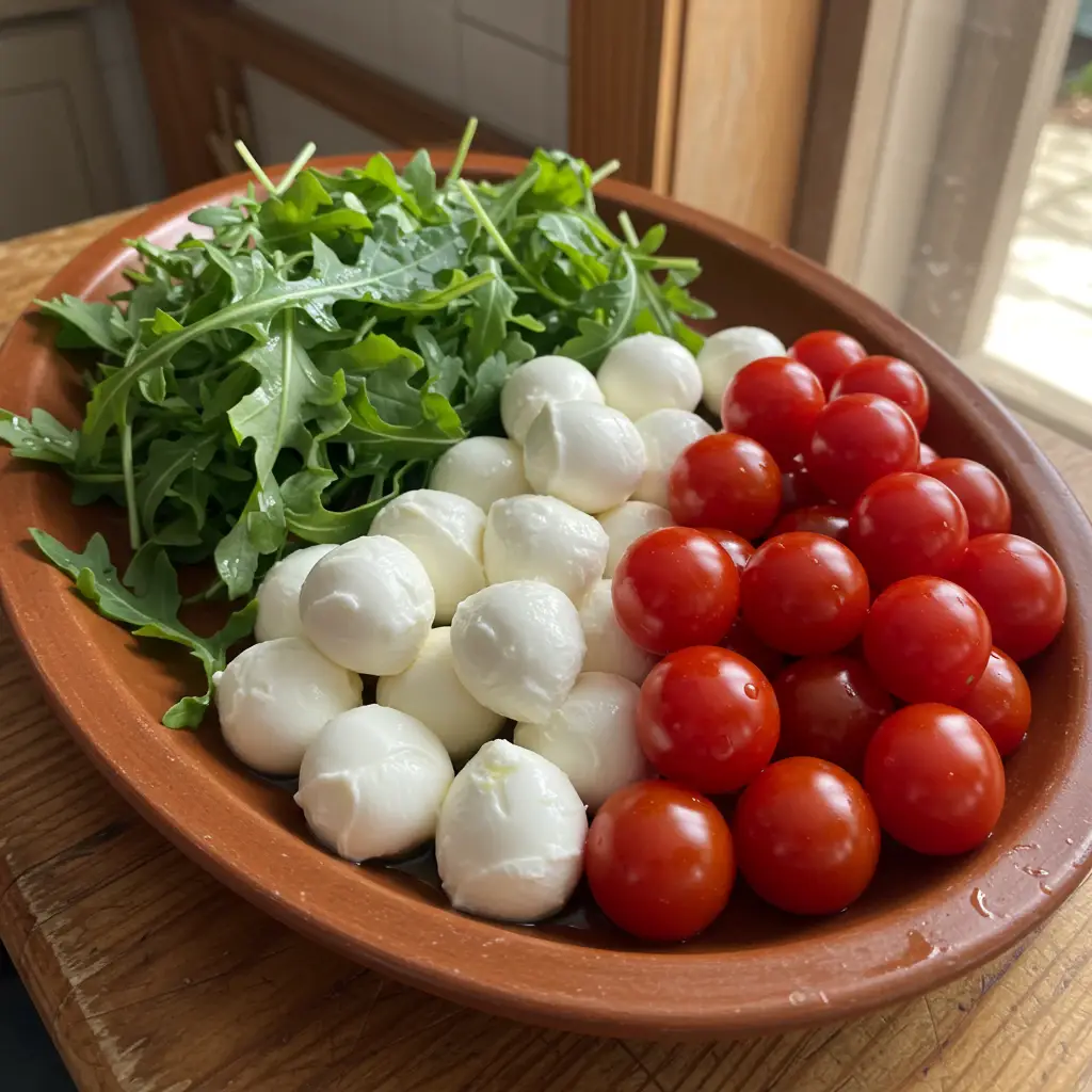 Uma salada leve e saborosa, perfeita para um almoço ou jantar fresco. A combinação da rúcula, mussarela de búfala e tomate cereja é irresistível, realçada por um toque de azeite e vinagre.