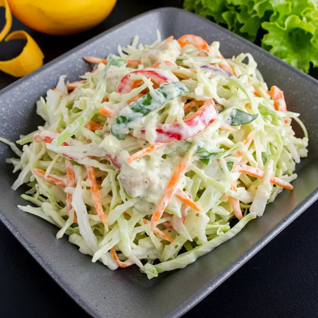 Uma salada leve e refrescante, perfeita para um almoço ou jantar. A combinação de pimentões coloridos, repolho e cenoura cria um prato vibrante e saboroso. O toque cremoso do creme de leite e maionese completa a experiência.
