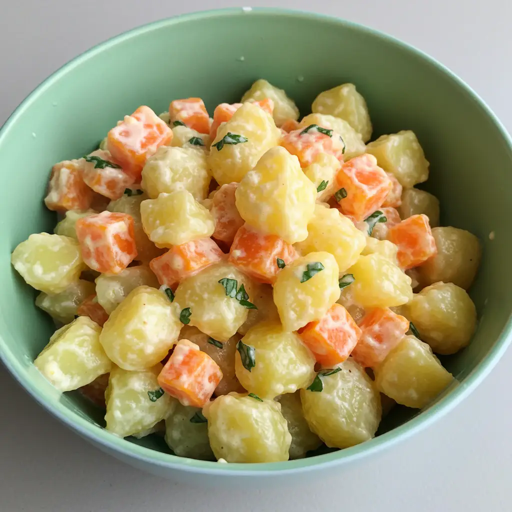 Uma salada leve e saborosa, perfeita para um almoço ou jantar. As batatas e cenouras cozidas, combinadas com maionese cremosa e legumes frescos, criam uma explosão de sabores. A apresentação especial com a rosa de tomate encanta a todos!