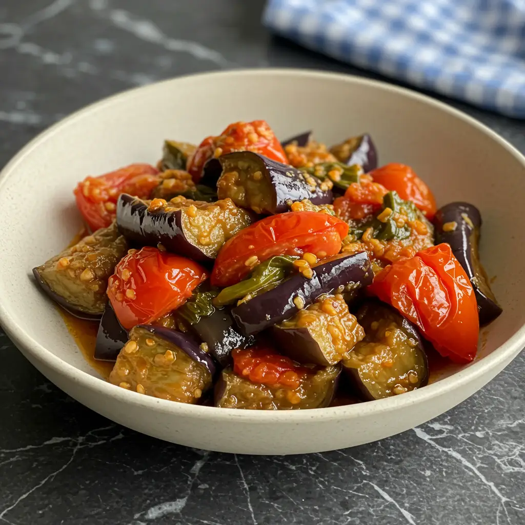 Uma salada vibrante e saborosa, perfeita para um almoço leve ou acompanhamento de carnes grelhadas. A berinjela, macia e saborosa, harmoniza com os tomates frescos e o toque especial do shoyu.
