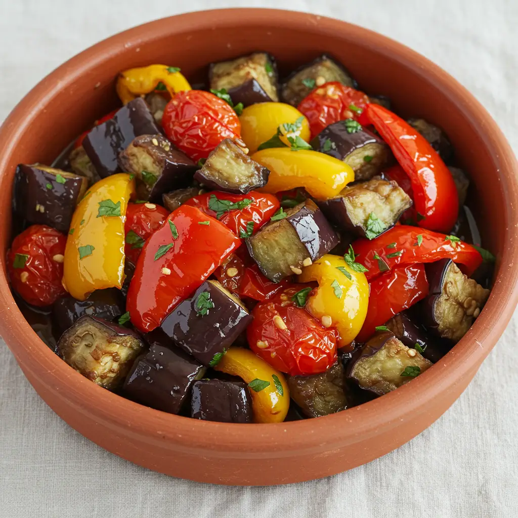 Uma salada brasileira vibrante e saborosa, com berinjela assada, pimentões coloridos, tomates suculentos e um toque de acidez. Perfeita para um almoço leve ou acompanhamento de carnes grelhadas.