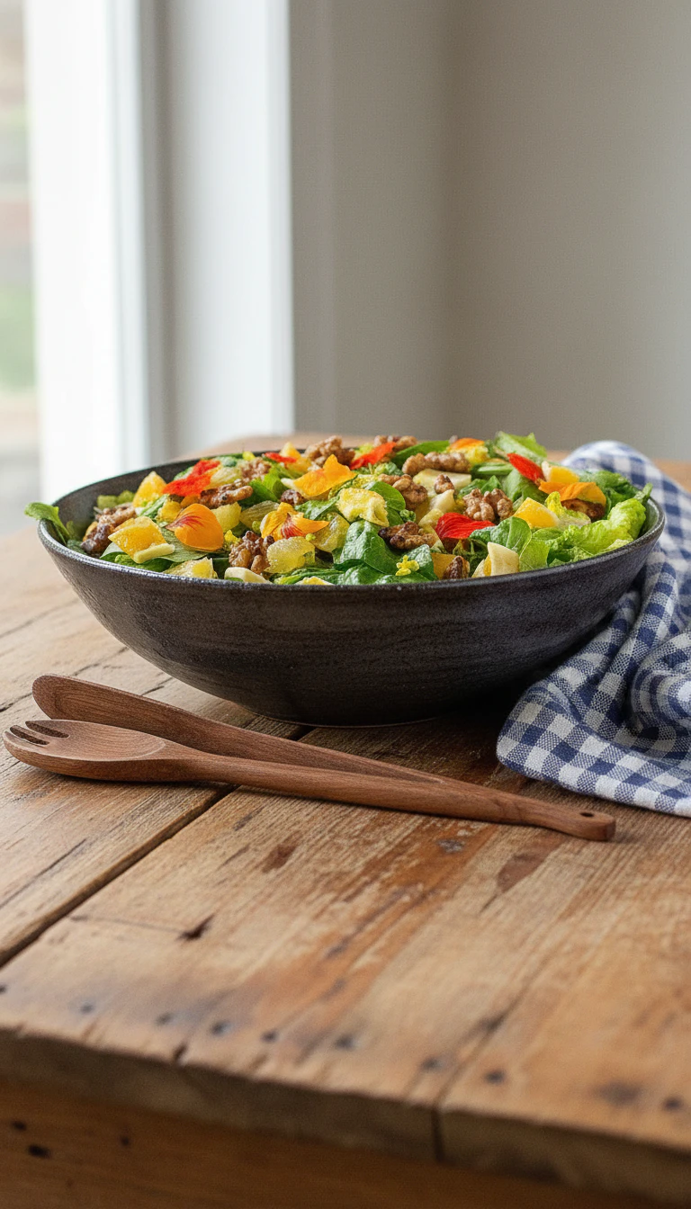 Uma salada leve e saborosa, perfeita para um almoço ou jantar. As nozes picantes adicionam um toque especial, contrastando com o frescor das folhas e o toque cítrico da laranja.
