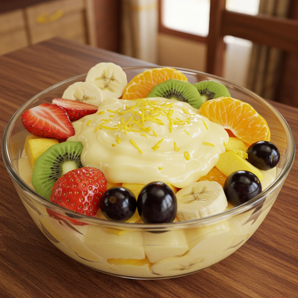 Uma explosão de sabores tropicais, a salada de frutas com creme de limão é a sobremesa perfeita para refrescar seu dia. Delicie-se com a combinação de frutas frescas e um toque cremoso e cítrico.