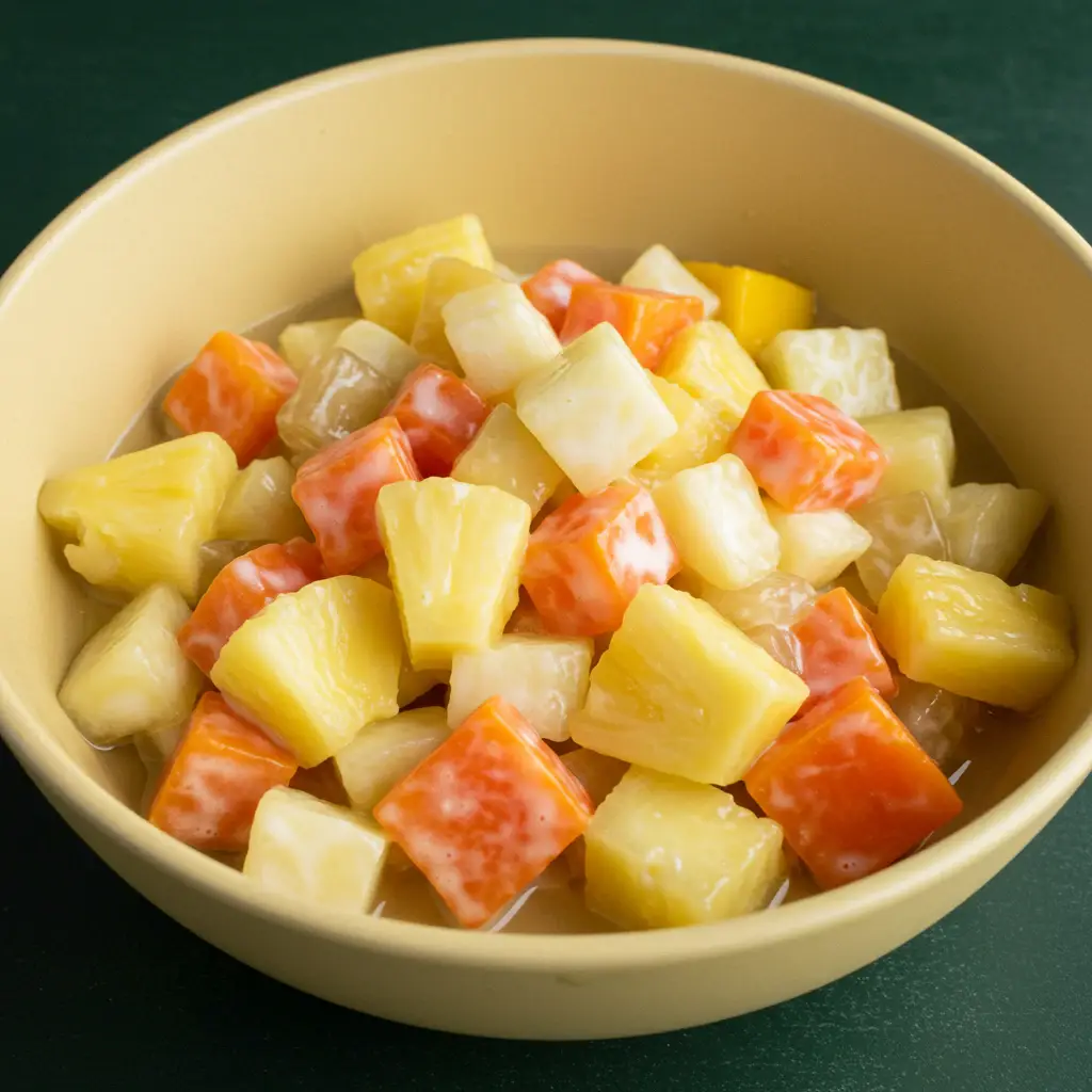 Uma salada de frutas refrescante e deliciosa, perfeita para um dia quente! A combinação de frutas em calda com leite condensado e creme de leite cria uma textura cremosa irresistível. Ideal para sobremesas ou como acompanhamento.