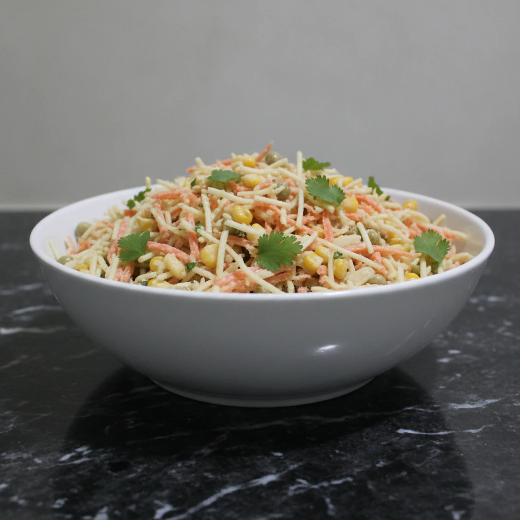Sirva a salada de macarrão gelada, decorada com batata palha.