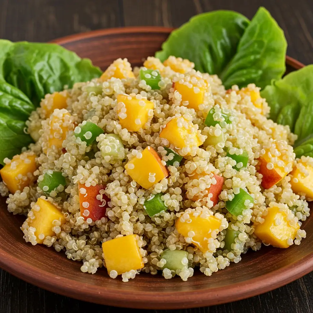 Prepare a salada: Escorra a quinoa e deixe esfriar completamente. Em uma tigela grande, misture a quinoa cozida, o pimentão verde picado, a manga picada e a cebolinha verde.