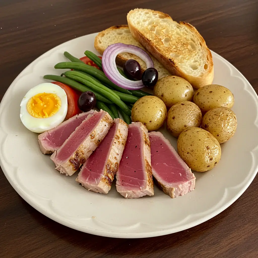 Uma salada fresca e saborosa, perfeita para um almoço leve e sofisticado. Combinação clássica de atum grelhado, batatas assadas, ovos e legumes, temperada com azeite e ervas.