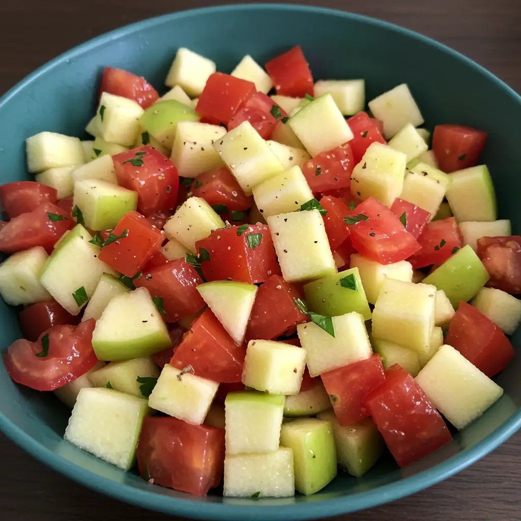 Uma salada leve e saborosa, perfeita para um almoço rápido ou acompanhamento de carnes grelhadas. O toque adocicado da maçã contrasta com o frescor da couve e o sabor do tomate. Ideal para dias quentes!