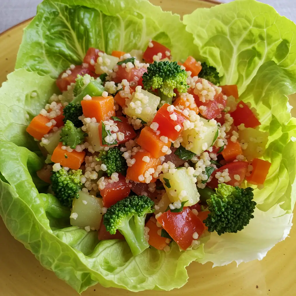 Coloque a salada de trigo e legumes sobre as folhas de alface.