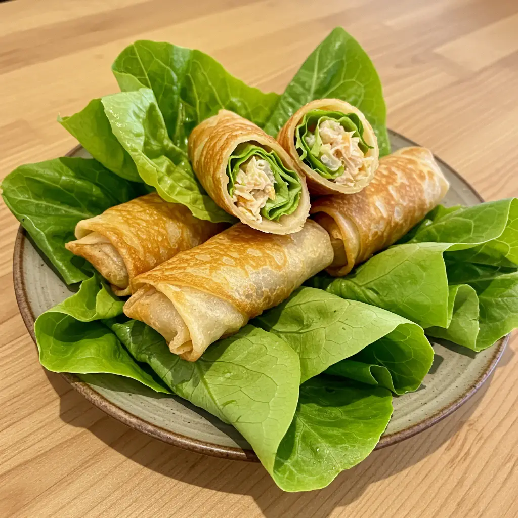 Uma combinação fresca e saudável de alfaces crocantes com mini panquecas de cenoura recheadas com atum e maionese, perfeita para um almoço leve ou um lanche nutritivo.